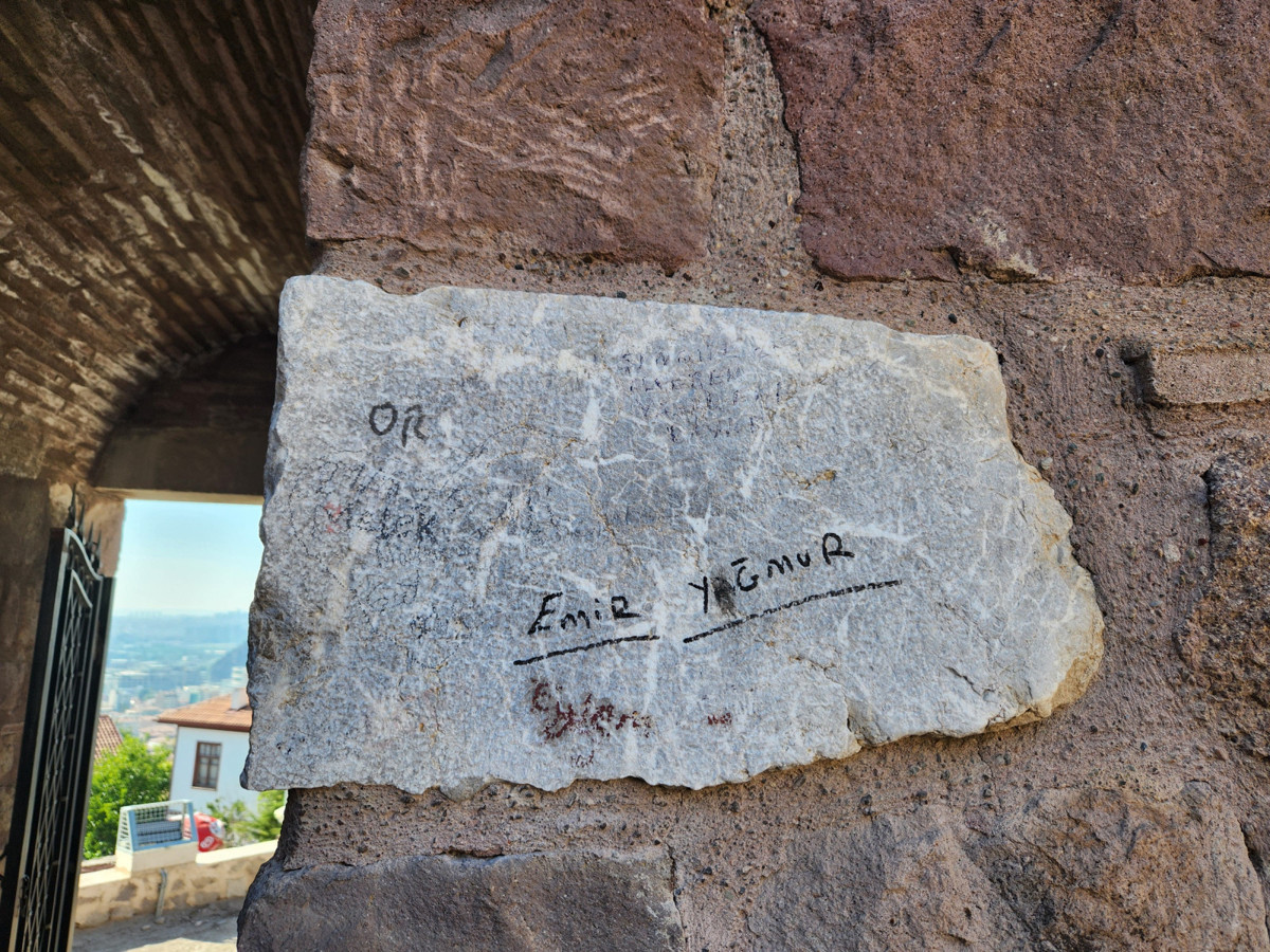 Kent genelinde binaların dış cepheleri, köprü altları, çöp konteynerleri, metro istasyonlarında yer alan kapı ve duvarların yanı sıra tarihi yapılarda da duvar yazıları dikkat çekiyor. Uzun yıllardır Ankara'nın önemli simgeleri arasında yer alan Ankara Kalesi'nde de çok sayıda duvar yazısı dikkat çekiyor. Yılın hemen hemen her mevsiminde yerli ve yabancı turistlerin ilgisini çekerek Ankara'ya turizm geliri sağlayan Ankara Kalesi, tarihi dokusunu kaybetme riskiyle karşı karşıya. Kale duvarlarına yazılan isimler ve çizilen simgeler, görüntü kirliliğinin yanı sıra kalenin tarihi dokusunda zarar veriyor.
