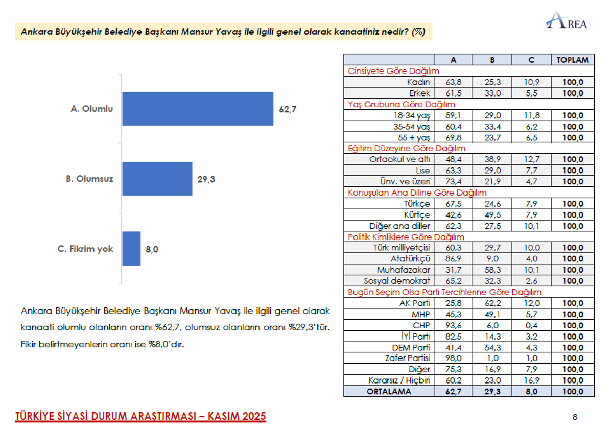 AREA Araştırma’nın Kasım 2025 anketi, Ankara Büyükşehir Belediye Başkanı Mansur Yavaş’a seçmen desteğinin yüksek olduğunu ve yolsuzluk iddialarını gündeme getiren AK Parti Ankara Milletvekili Osman Gökçek’in iddialarına çoğunluğun inanmadığını ortaya koydu.