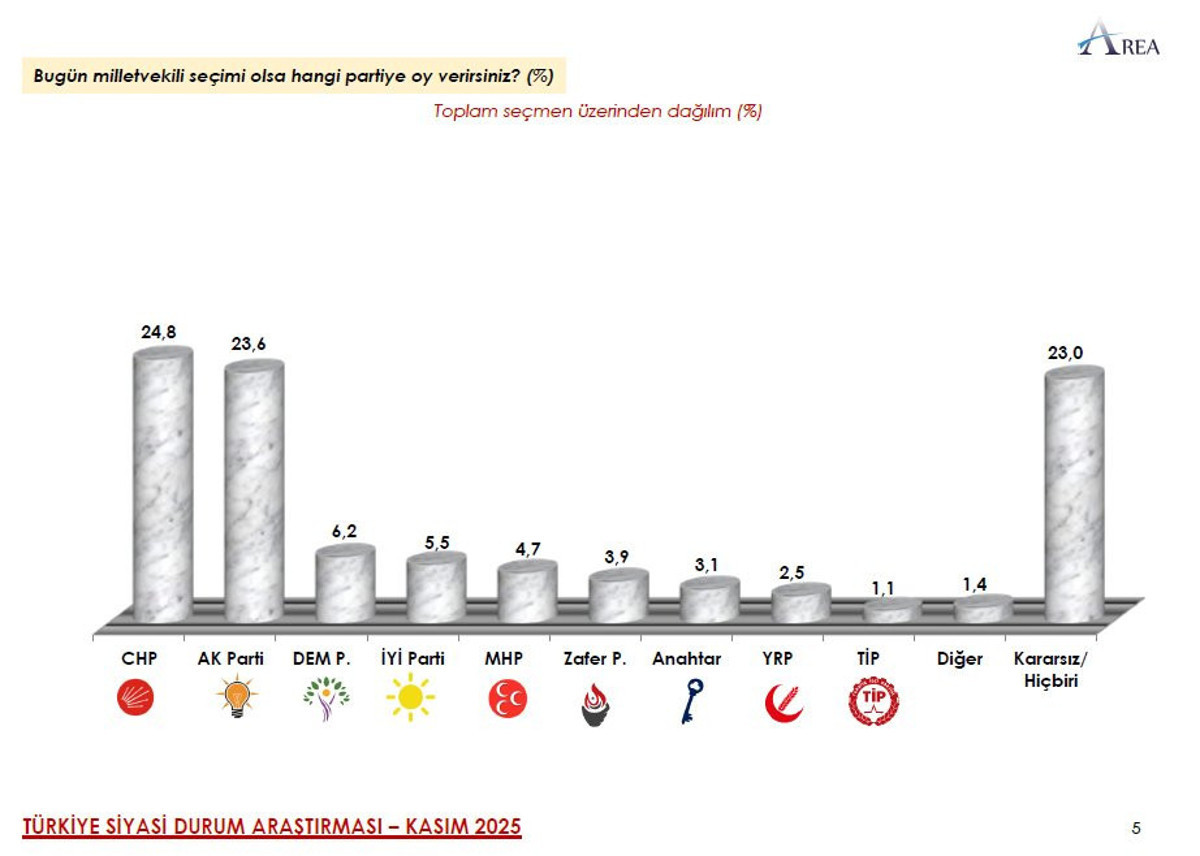 AREA Araştırma’nın Kasım 2025 tarihli Türkiye Siyasi Gündem Araştırması, seçmenlerin parti tercihleri ve gündemdeki siyasi konulara dair görüşlerini ortaya koydu. Araştırma, 22-24 Kasım tarihlerinde 26 ilde, kır-kent ayrımı gözetilerek, 18 yaş ve üzeri 2bin kişiyle CATI yöntemiyle gerçekleştirildi. Örneklem hata payı yüzde 2,19 olarak belirlendi.