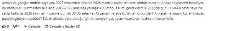 “2007 modelden 2025 modele kadar binlerce otobüs mevcut. Ancak büyükşehir belediyesi bu otobüsleri işletmekten bile aciz” diyen bir kullanıcı, 2019-2025 arasında 400’e yakın otobüs alınmasına rağmen sefer sayılarında düşüş yaşandığını iddia etti.