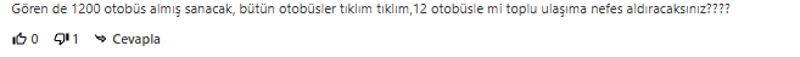 Bir kullanıcı, “Gören de 1200 otobüs almış sanacak, bütün otobüsler tıklım tıklım. 12 otobüsle mi toplu ulaşıma nefes aldıracaksınız?” ifadeleriyle tepkisini gösterdi.
