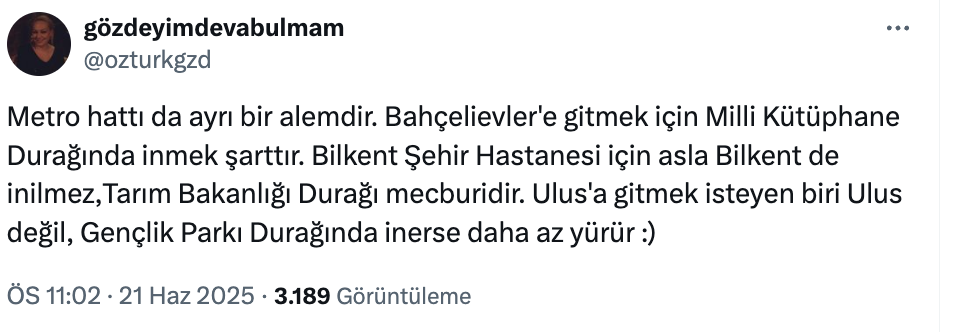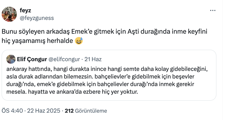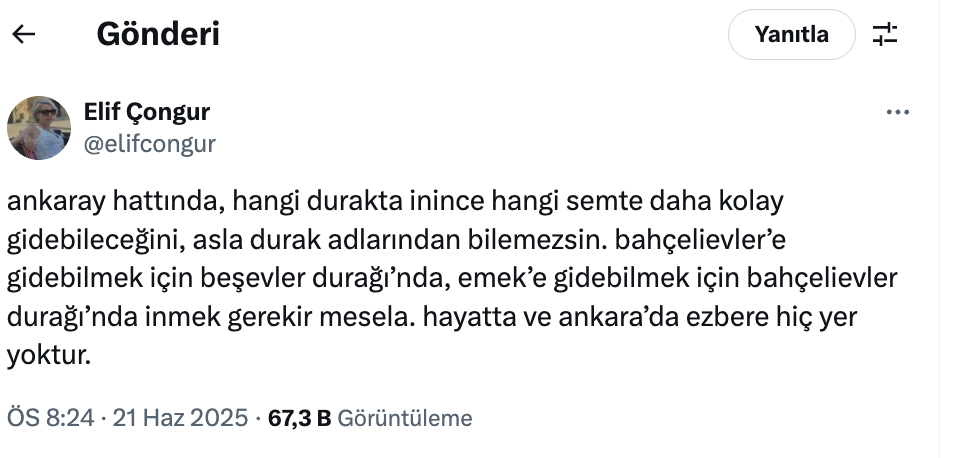 Ankara’nın Ankaray hattını kullananlar arasında yıllardır süregelen bir karmaşa, sosyal medyada esprili bir dille yeniden gündeme geldi. Kullanıcı Elif Çongur’un viral olan tweetinde, durak isimleri ile ulaşılan semtler arasındaki çelişki mizahi bir dille anlatıldı.