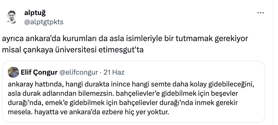 “Ankaray hattında, hangi durakta inince hangi semte daha kolay gidebileceğini, asla durak adlarından bilemezsin. Bahçelievler’e gidebilmek için Beşevler durağında, Emek’e gidebilmek için Bahçelievler durağında inmek gerekir mesela. Hayatta ve Ankara’da ezbere hiç yer yoktur.”