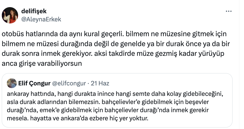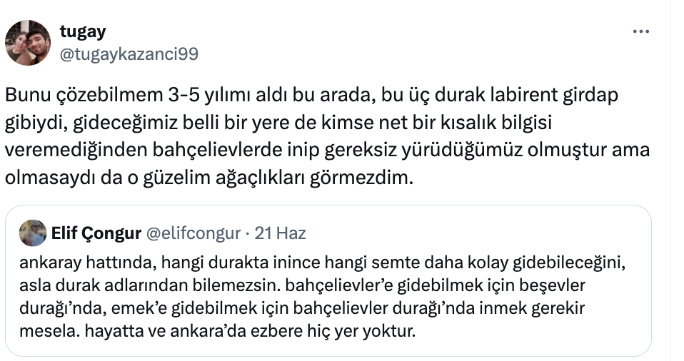 Bu tespit, Ankara’yı ilk kez ziyaret eden ya da şehre yeni taşınanlar için adeta bir şehir navigasyon bilmecesi sunuyor. Durak isimlerinin yanıltıcı olması, kullanıcıların deneyimle öğrenmesini gerektiriyor. Örneğin, Beşevler durağı aslında Bahçelievler 7. Cadde’ye en yakın durakken, Bahçelievler durağında inen biri kendini Emek’in kapısında bulabiliyor.