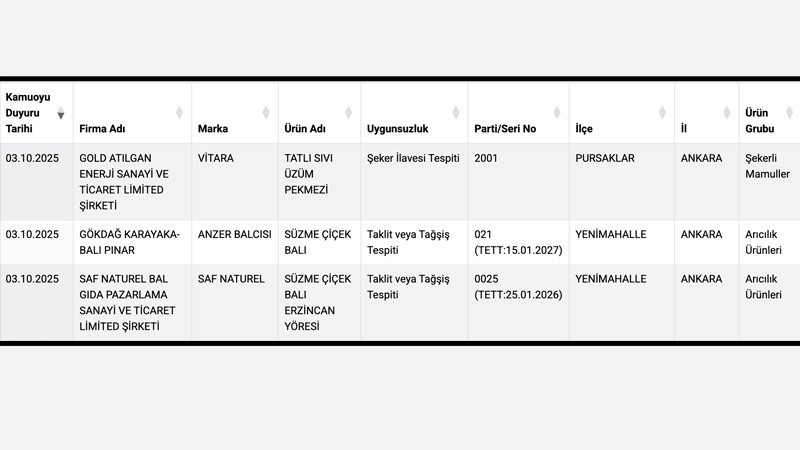 Tarım ve Orman Bakanlığının güncel listesine göre Pursaklar'daki Gold Atılgan Enerji Sanayi ve Ticaret Limited Şirketine bağlı Vitara markasının tatlı sıvı üzüm pekmezinde şeker ilavesi tespit edildi.