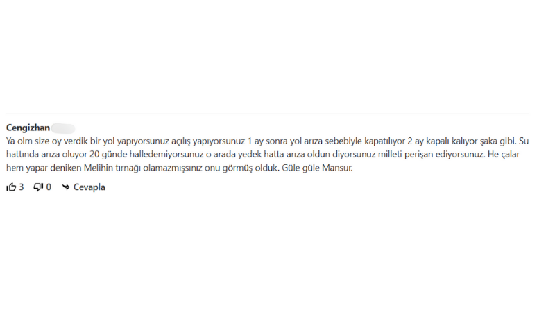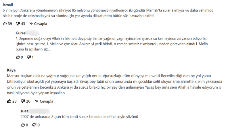 Tepkilerin bir bölümü ise eski belediye başkanı Melih Gökçek’e yöneldi. Bazı vatandaşlar, “2007’de Ankara’yı 8 gün susuz bırakan Melih’i unuttunuz mu? O dönem de çözüm bulunamamıştı.” diyerek geçmişi hatırlattı. Başka bir vatandaşın, “Melih’in yıllarca yapmadığını şimdi Mansur’dan bekliyorsunuz, bu sorun yeni değil.” ifadeleriyle tartışmanın siyasi boyutu öne çıktı.