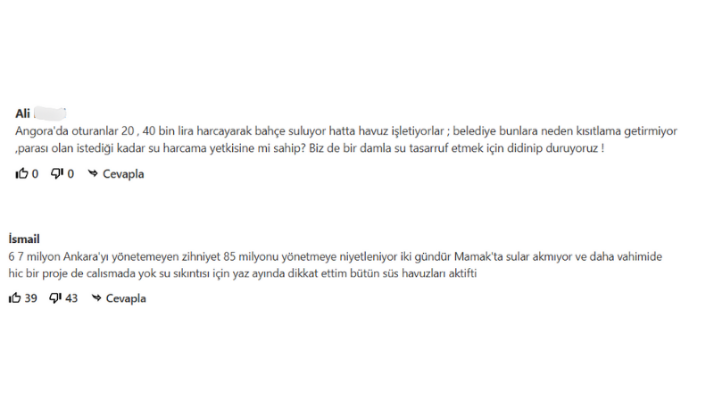Angora gibi üst gelir grubunun yaşadığı bölgelerde bahçelerin litrelerce suyla sulanması ve özel havuzların doldurulması da tepkilerin odağında. Vatandaşlar, “Biz damla damla su tasarrufu yapıyoruz, bazıları sınırsız su tüketiyor. Bu adalet mi?” sözleriyle duruma isyan etti. Ayrıca kent genelinde süs havuzlarının hâlâ çalışmaya devam etmesi de tepki çeken konular arasında yer aldı.