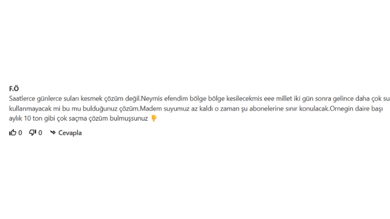 Bazı yurttaşlar dönüşümlü kesinti yönteminin kalıcı çözüm olmayacağını savunarak, daha radikal önlemler talep etti. “İki gün susuz kalan vatandaş, su gelir gelmez daha çok tüketir. Çözüm bu değil, daire başına tüketim sınırı getirilmeli.” önerisi paylaşıldı.