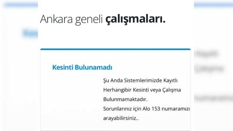 “Şu anda sistemlerimizde kayıtlı herhangi bir kesinti veya çalışma bulunmamaktadır. Sorunlarınız için Alo 153 numaramızı arayabilirsiniz.”