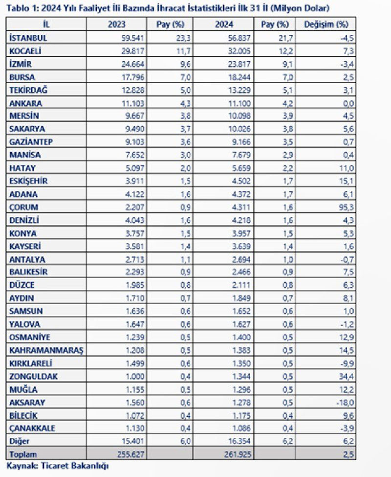 Ticaret Bakanlığından yapılan açıklamada "2024 yılında mal ihracatımız yüzde 2,5 oranında artış ile 262 milyara yükseldi ve Cumhuriyet tarihimizin rekoru kırılmış oldu. Bu ihracat değerindeki payı bakımından 56 milyar 837 milyon dolar ile İstanbul birinci sırayı alırken, Kocaeli 32 milyar 5 milyon dolar ile ikinci sırayı, İzmir 23 milyar 817 milyon dolar ile üçüncü sırayı aldı" ifadeleri kullanıldı.