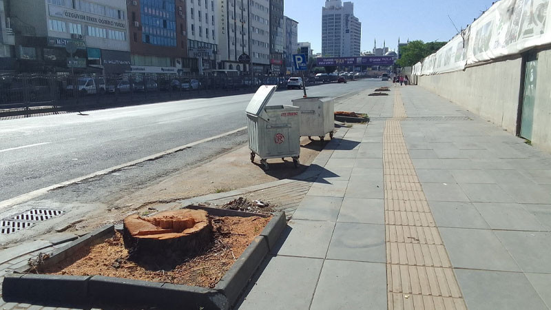 Vatandaşlar tarafından paylaşılan eski ve yeni görüntüler, yeşil dokunun ne denli hızlı kaybolduğunu gözler önüne serdi. Bir zamanlar gölgesiyle caddeyi kaplayan dev ağaçların yerinde şimdi sadece kesilmiş kökler ve çöp konteynerleri duruyor. KOSGEB binasının karşısında en az 5 ağacın kesildiği tespit edildi. Kesimin yeni yapıldığı ve ağaçların kökü üzerinde talaşların durduğu da görüldü.