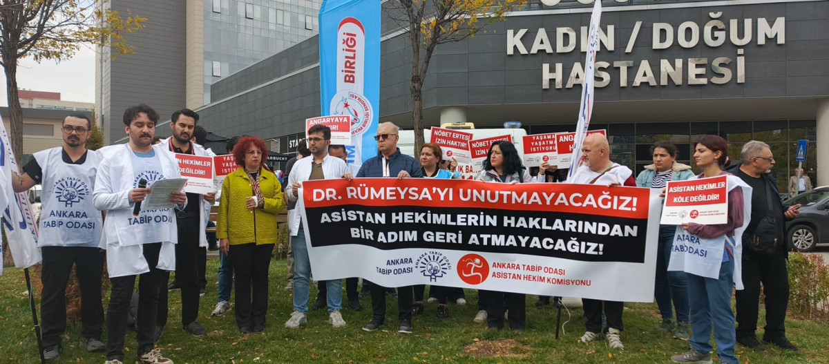 Dervişoğlu, Şen’in içinde bulunduğu ağır çalışma koşullarının bir kazaya değil, sistemin yarattığı yorgunluğa işaret ettiğini söyleyerek, “Bugün bir kez daha, ısrarla Dr. Rümeysa Şen’i çalıştığı hastane önünde anıyoruz. Hiçbir asistan hekim arkadaşımızı arkada bırakmayacak, insanca yaşama ve çalışma hakkımız için bu kazanımın takipçisi olacağız. Arkadaşımızı andığımız bugünlerde yeni açıklanan Tıpta Uzmanlık Sınavı’nın çarpıcı sonuçlarını görüyoruz. Çocuk sağlığı ve hastalıkları, Acil tıp, Genel cerrahi, Göğüs cerrahisi, çocuk cerrahisi ve kadın hastalıkları ve doğum bölümlerinde asistan hekimlerin tercih etmediği onlarca eğitim programı olması yetkililere ve bizlere çok şey anlatıyor. Tıpta uzmanlık eğitimi koşullarında niteliğin, standardın ve insanca çalışma şartlarının sağlanması ülkemizde sağlık sisteminin geleceği için ertelenemez bir ihtiyaçtır. Asistan hekim arkadaşlarımıza çağrımızdır: Yalnız değiliz. Angarya çalışmaya, mobbinge, nöbet ertesi iznimizin engellenmesine ve geleceksizliğe boyun eğmek zorunda değiliz.” diye aktardı.