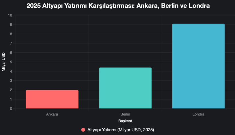 Raporda şehir bazlı değerlendirme bulunmasa da, Ankara’nın mevcut altyapı bütçesi Avrupa başkentlerine kıyasla sınırlı görünüyor.