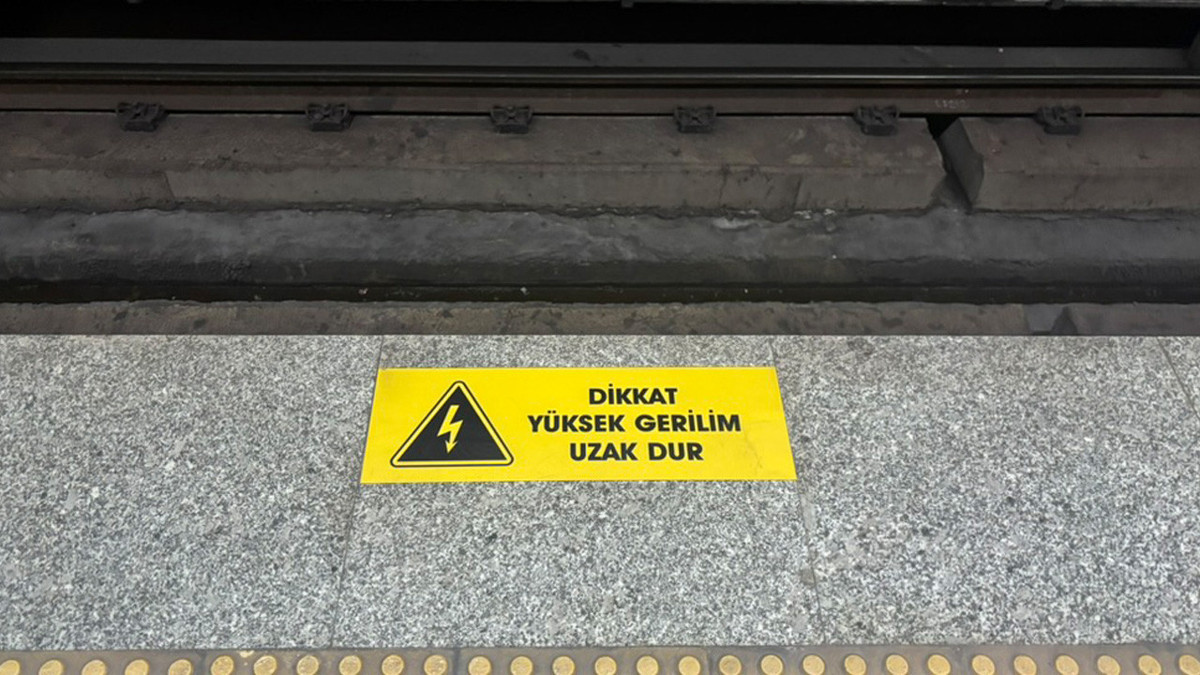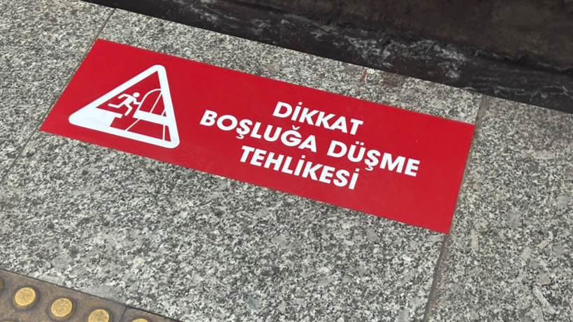 Ankara metrosunda peron zemininde belirli aralıklarla yerleştirilen “Dikkat, boşluğa düşme tehlikesi” yazılı kırmızı işaretler, özellikle yoğun saatlerde peron ile tren arasındaki boşluğun fark edilmeden adım atılmasını engellemeyi amaçlıyor.