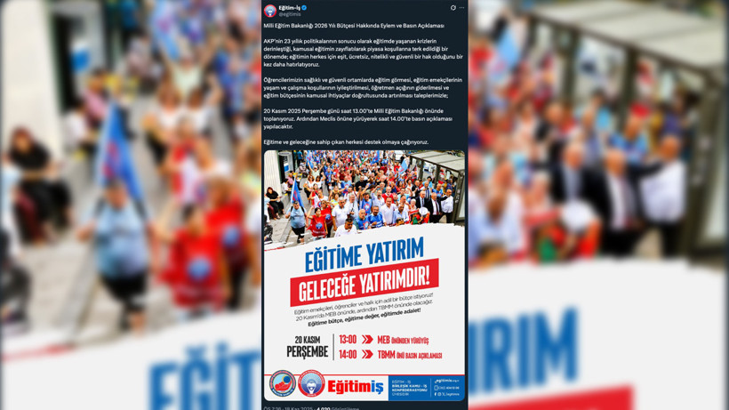 Eğitim-İş, Milli Eğitim Bakanlığının 2026 yılı bütçesine ilişkin olarak 20 Kasım Perşembe (yarın) günü Ankara’da eylem ve basın açıklaması düzenleyeceğini duyurdu.