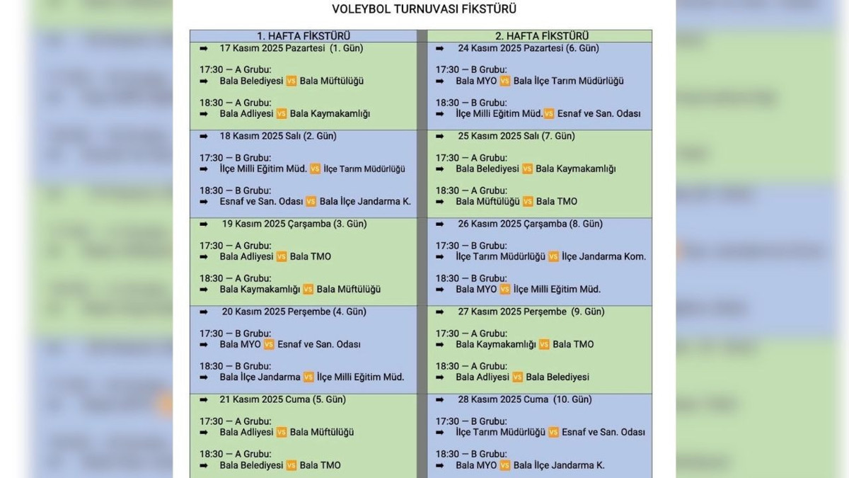 Turnuva, 17 Kasım’dan 28 Kasım’a kadar sürecek ve her gün iki maç oynanacak. İlk gün, A Grubu maçlarıyla start alacak; Balâ Belediyesi ile Balâ Müftülüğü saat 17.30’da, Balâ Adliyesi ile Balâ Kaymakamlığı ise saat 18.30’da karşı karşıya gelecek. İlerleyen günlerde B Grubu maçlarıyla turnuva devam edecek. Fikstür boyunca tüm gruplar, birbirleriyle karşılaşarak puan mücadelesi verecek.