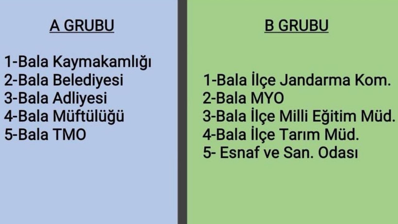 Turnuvaya A ve B gruplarında toplam 10 takım katılıyor. A Grubu’nda Balâ Kaymakamlığı, Balâ Belediyesi, Balâ Adliyesi, Balâ Müftülüğü ve Balâ TMO yer alıyor. B Grubu’nda ise Balâ İlçe Jandarma Komutanlığı, Balâ MYO, Balâ İlçe Milli Eğitim Müdürlüğü, Balâ İlçe Tarım Müdürlüğü ve Esnaf ve Sanatkarlar Odası mücadele edecek.