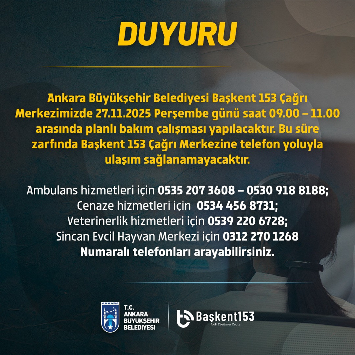 Ankara Büyükşehir Belediyesi tarafından sosyal medyadan yapılan duyuruda şu ifadeler yer aldı: "Ankara Büyükşehir Belediyesi Başkent 153 Çağrı Merkezimizde 27.11.2025 Perşembe günü saat 09.00 – 11.00 arasında planlı bakım çalışması yapılacaktır. Bu süre zarfında Başkent 153 Çağrı Merkezine telefon yoluyla ulaşım sağlanamayacaktır. Ambulans hizmetleri için 0535 207 3608 - 05309188188; Cenaze hizmetleri için 0534 456 8731; Veterinerlik hizmetleri için 0539 220 6728; Sincan Evcil Hayvan Merkezi için 0312 270 1268 Numaralı telefonları arayabilirsiniz."