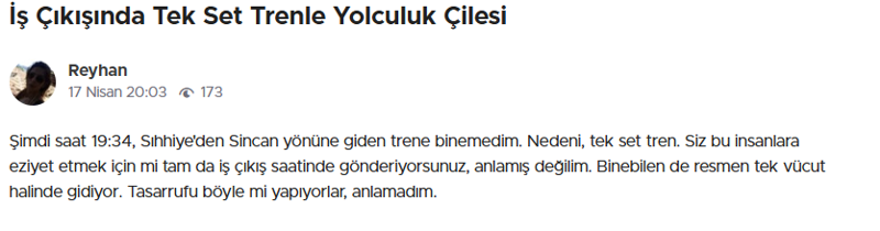 Aynı gün akşam saatlerinde şikayetini yazan başka bir vatandaş ise, iş çıkışında Sıhhiye’den Sincan yönüne giden trene binemediğini aktardı: “Tek set tren geliyor, binebilen de resmen tek vücut halinde gidiyor. Tam da iş çıkış saatinde bu şekilde tren göndermek eziyet.”