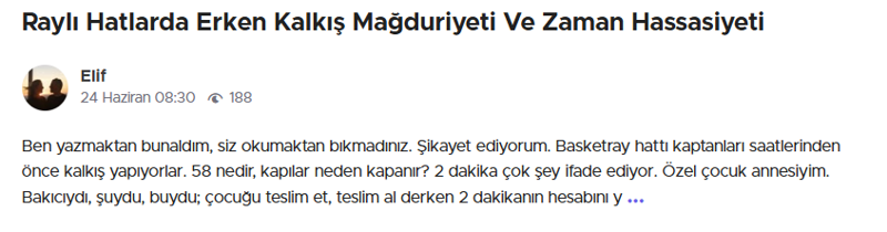 Elif isimli yolcu, 24 Haziran’da yaptığı paylaşımda trenlerin saatinden önce kalkış yaptığını öne sürerek, “Kaptanlar dakikalara dikkat etmiyor. 2 dakika çok şey ifade ediyor, yazmaktan bunaldım” ifadelerini kullandı.