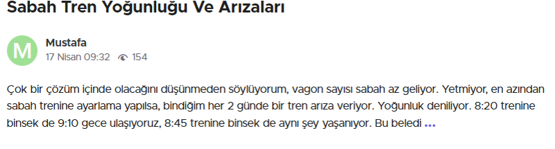 17 Nisan’da şikayetini paylaşan bir vatandaş, sabah saatlerinde vagon sayısının yetersiz olduğunu belirterek, “Yetmiyor, en azından sabah trenine ayarlama yapılsa. Bindiğim her 2 günde bir tren arıza veriyor. 8:20 trenine binsek de 9:10 gece ulaşıyoruz” ifadeleriyle yaşadığı mağduriyeti dile getirdi.