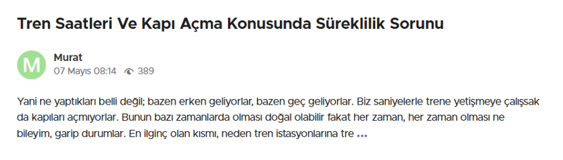 Murat isimli yolcu da trenlerin kapılarının çoğu zaman açılmadığını belirterek, “Bazen erken geliyorlar, bazen geç geliyorlar. Biz saniyelerle trene yetişmeye çalışsak da kapıları açmıyorlar” diyerek süreklilik sorunu yaşandığını kaydetti.