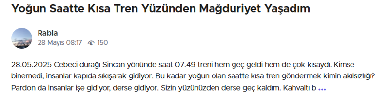 28 Mayıs’ta Cebeci durağında mağduriyet yaşayan bir vatandaş ise, 07:49 treninin hem geç geldiğini hem de kısa olduğunu belirterek, “Kimse binemedi, insanlar kapıda sıkışarak gidiyor. Bu kadar yoğun saatte kısa tren göndermek kimin akılsızlığı?” dedi.