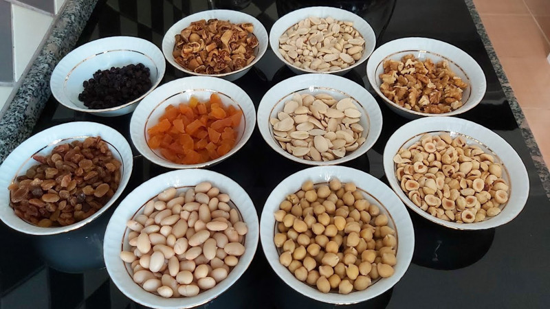 Fındık 750 TL, yer fıstığı içi 150 TL, sarı kuru üzüm 250 TL, ceviz içi 550 TL, kayısı 500 TL, incir 500 TL, badem 700 TL, yarma 40 TL, fasulye 75 TL, nohut 75 TL, şeker 45 TL