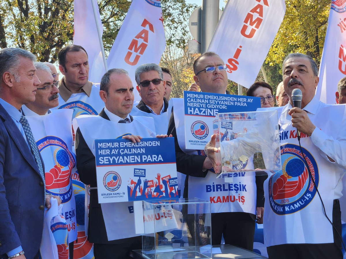 Birleşik Kamu-İş Konfederasyonu tarafından TBMM önünde düzenlenen basın açıklamasında konuşan Genel Başkan Orhan Yıldırım, "Senden benden topluyorlar, memurdan kesilen para halka değil faize gidiyor" dedi.
