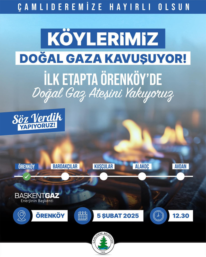 Belediye Başkanı Ceylan, "Örenköy’de doğal gaz ateşini yakıyor, köylerimizi temiz enerjiyle buluşturuyoruz" diyerek açılış törenine tüm vatandaşları davet etti. Tören, 5 Şubat 2025 Çarşamba günü saat 12.30'da Örenköy'de gerçekleştirilecek.