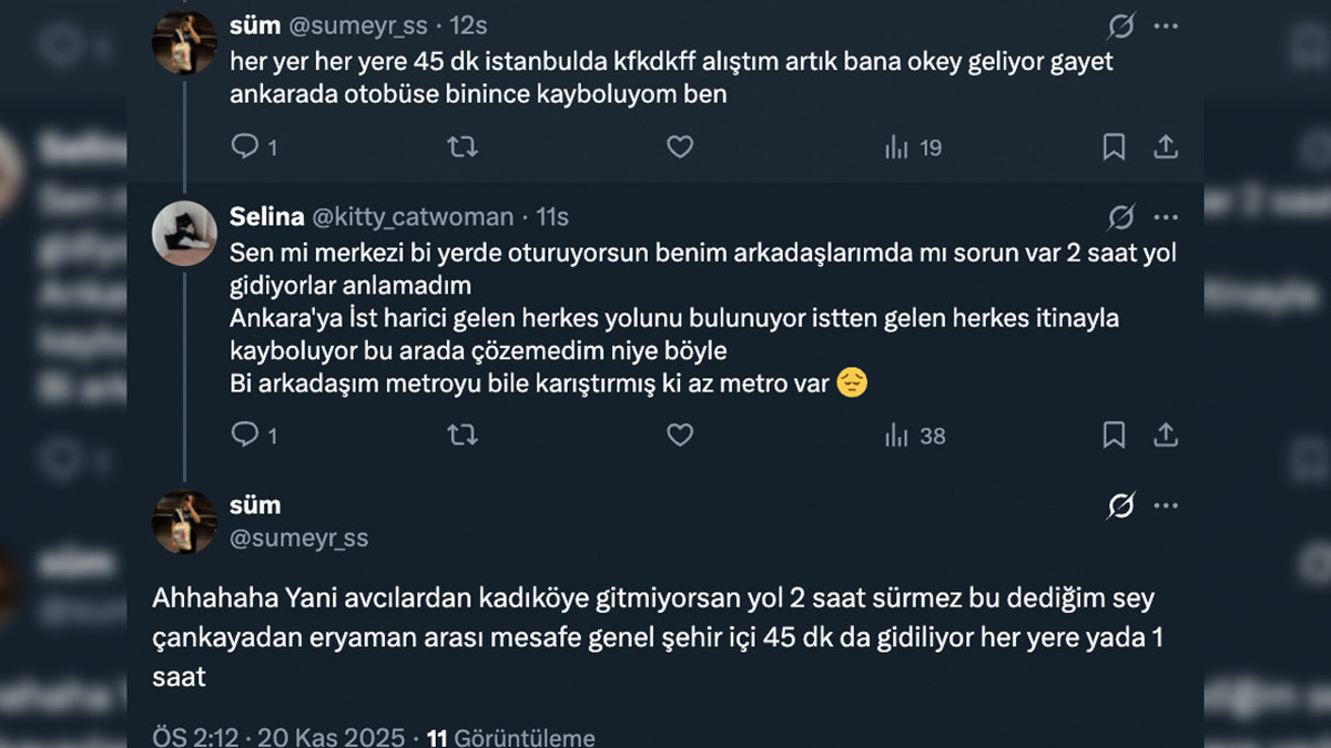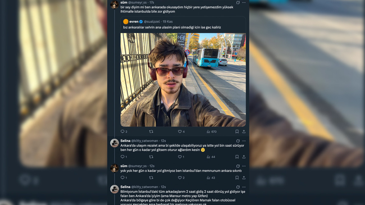 Her şey "sualpzel" adlı kullanıcının paylaşımıyla başladı. Evren isimli X kullanıcısı "Biz Ankaralılar şehrin ana ulaşım planı olmadığı için işe geç kalırız" diye yazdı. Ona yanıt bir başka kullanıcı "@sumeyr_ss"den geldi. O da "Bir şey diyeyim mi? Ben Ankara'da okusaydım hiçbir yere yetişemezdim yüksek ihtimalle. İstanbul'da bile zor gidiyorum" karşılığını verdi.