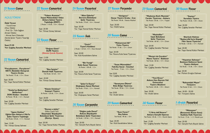 21 Kasım 2025 Cuma günü DTSM'de başlayan festivalde, tiyatroseverleri zengin bir program bekliyor. Bu yılki seçkide İran ve KKTC'den gelen oyunların yanı sıra Ankara, Balıkesir, Bolu, Denizli, Diyarbakır, İstanbul, İzmir, Kocaeli ve Uşak başta olmak üzere Türkiye'nin dört bir yanından toplam 28 farklı prodüksiyon sahne alacak.