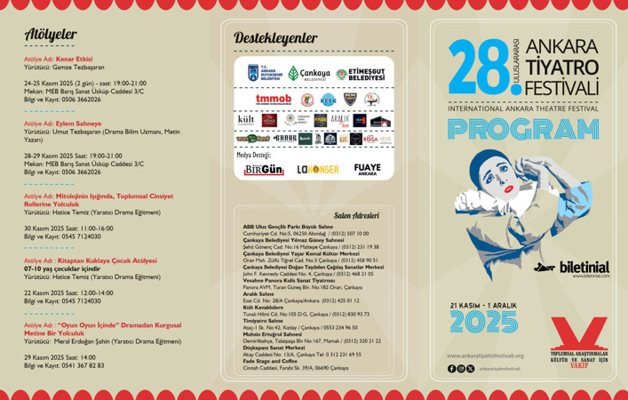 Festival, sadece oyunlarla sınırlı kalmıyor, vatandaşların deneyim kazanabileceği ve bilgi birikimini artırabileceği çeşitli atölye çalışmaları da sunuyor. Tiyatro ve yaratıcı drama alanındaki bu atölyeler için detaylı program şöyle: