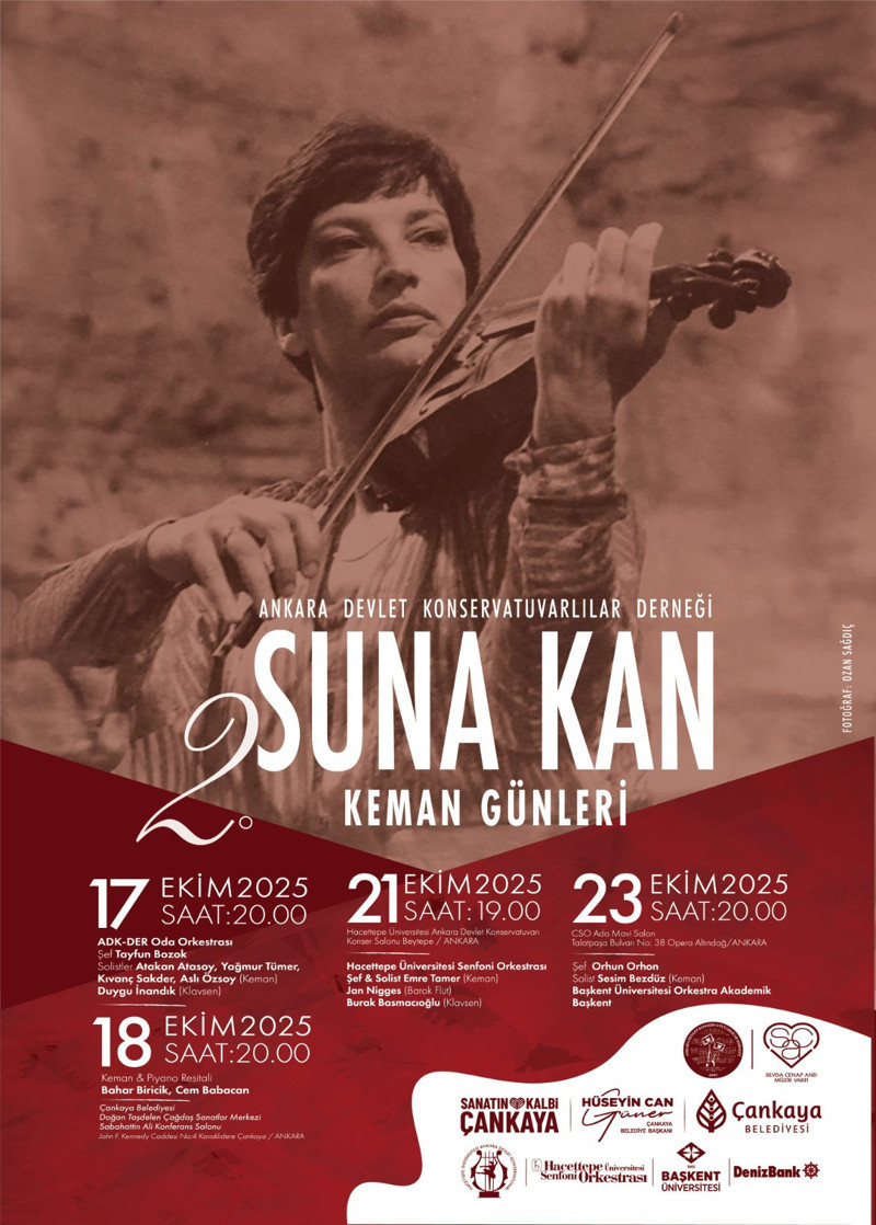 2023 yılında kaybettiğimiz dünyaca ünlü keman virtüözü Suna Kan, doğum günü haftasında 2. Suna Kan Keman Günleri ile anılacak. 17, 18, 21 ve 23 Ekim tarihlerinde ADK-DER Oda Orkestrası, Bahar Biricik ve Cem Babacan’ın Keman-Piyano konserleri, Orkestra Akademik Başkent ve Hacettepe Üniversitesi Senfoni Orkestrası’nın performanslarıyla sanatseverler unutulmaz müzik deneyimleri yaşayacak.