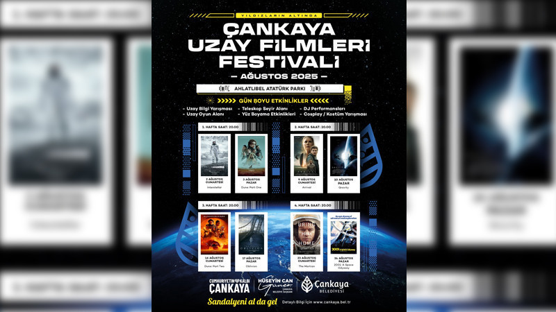 Çankaya Belediyesi’nin düzenlediği Uzay Filmleri Festivali başlıyor. Festival, 2 Ağustos Cumartesi saat 20.00’de başlayacak ve dört hafta boyunca her hafta sonu devam edecek. Gösterim günlerinde gün boyu çeşitli etkinlikler düzenlenecek. Bunlar arasında uzay bilgi yarışmaları, uzay oyun alanı, teleskopla gözlem, yüz boyama etkinlikleri, DJ performansları ve cosplay kostüm yarışmaları yer alacak.