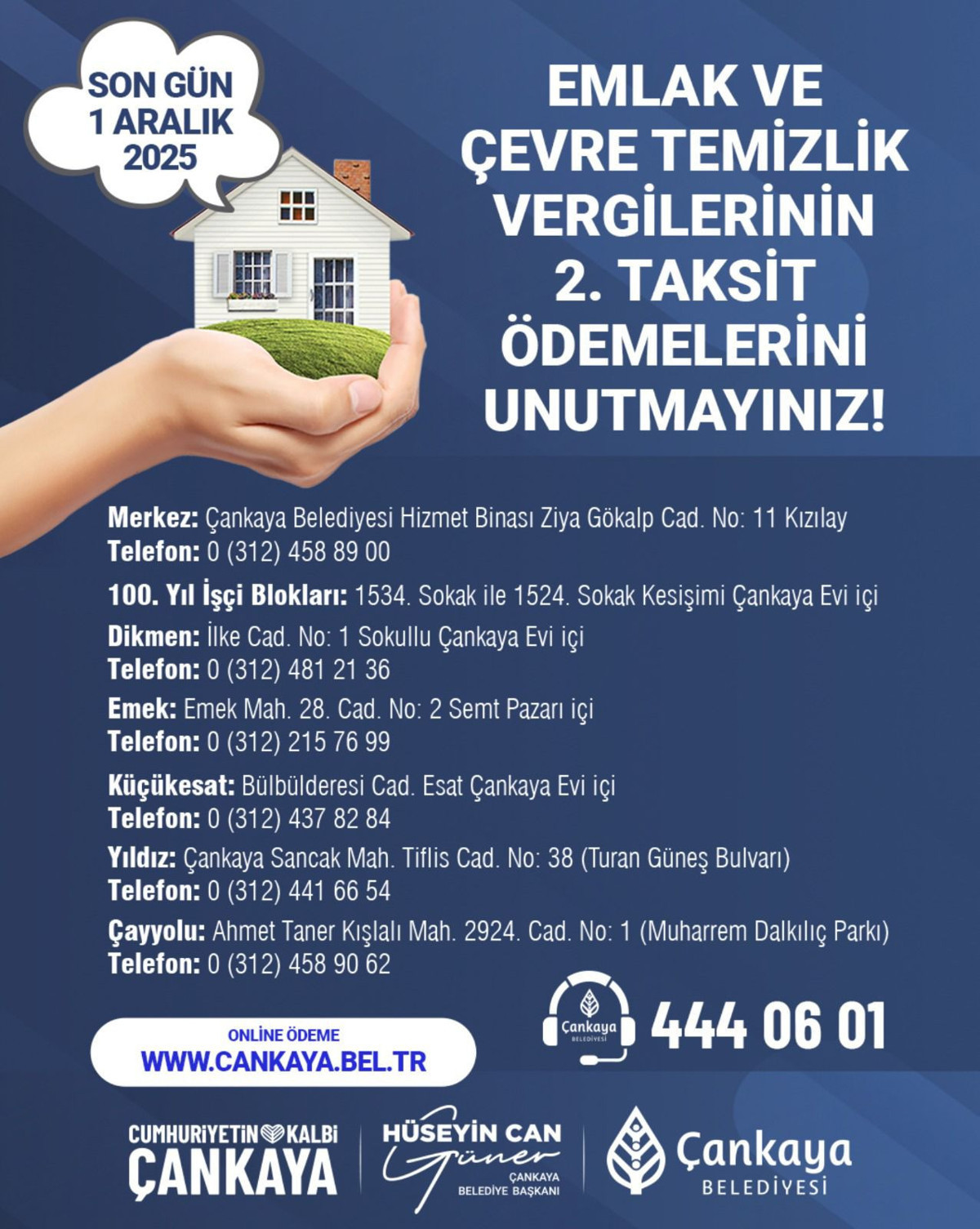 Çankaya Belediyesi, 2025 yılı emlak ve çevre temizlik vergisi ikinci taksit ödemelerinin son günü olarak 1 Aralık 2025 tarihini açıkladı ve vatandaşları bu tarihe kadar ödeme yapmaları konusunda uyardı.