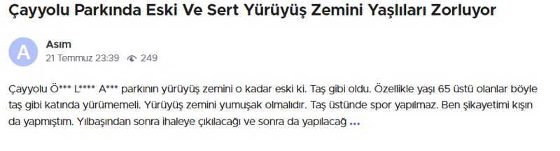 21 Temmuz’da Asım adlı bir vatandaş, Çayyolu’ndaki bir parkın yürüyüş zeminine dikkat çekti. Yürüyüş yollarının taşla kaplanmış olması, özellikle 65 yaş üzerindeki bireyler için ciddi bir tehlike oluşturuyor. Vatandaş, bu durumu daha önce de belediyeye bildirdiğini ancak herhangi bir iyileştirme yapılmadığını söyledi.