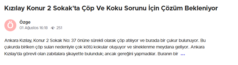 Ankara'nın merkezine yakın bölgelerden Kızılay Konur 2 Sokak ve Keklikpınarı Mahallesi de temizlik sorunlarıyla gündeme geldi. 1 Ağustos’ta Özge adlı bir şikayetçi, Kızılay’daki çöp yığınları ve kötü kokuları şikayet etti. Çukurda biriken çöp suları, sineklenme ve kötü kokulara neden oluyor. Belediye zabıtalarına yapılan başvuruların sonuçsuz kaldığını belirten Özge, çözüm beklediğini dile getirdi.