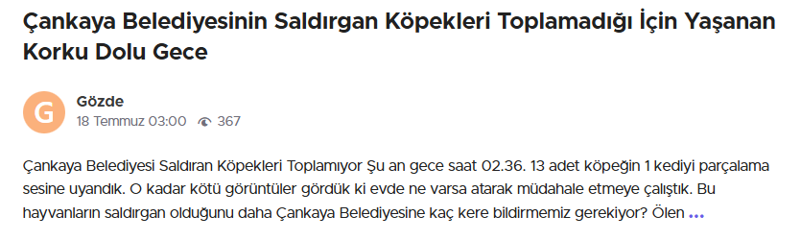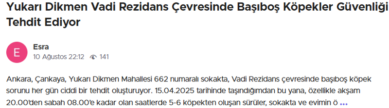 Çankaya'nın başka bölgelerinde de benzer sorunlar yaşanıyor. Özellikle 10 Ağustos'ta Esra adlı bir şikayetçi, Yukarı Dikmen Vadi Rezidans çevresinde başıboş köpeklerin güvenliği tehdit ettiğini belirtti. Gece saatlerinde köpekler yüzünden arabaya bile ulaşmanın imkansız hale geldiğini belirten Esra, bu konuda ciddi önlemler alınmasını istedi.