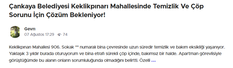 Keklikpınarı Mahallesi'nden gelen şikayette ise, bir vatandaş, bölgedeki temizlik ve bakım eksikliklerinin 3 yıldır devam ettiğini söyledi. “Bina etrafı sürekli çöp içinde, bakımsız bir halde,” diyen vatandaş, apartman görevlisinin de durumu reddettiğini ifade etti.