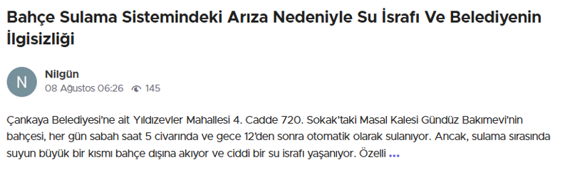 Çankaya Belediyesine ait Yıldızevler Mahallesi’ndeki Masal Kalesi Gündüz Bakımevi'nin bahçesinde, her sabah ve gece saatlerinde sulama sisteminin arızalı olduğu ve suyun büyük kısmının bahçe dışına aktığı belirtiliyor. Nilgün adlı bir şikayetçi, bu durumu defalarca bildirmelerine rağmen çözüm üretilmediğini vurguladı ve büyük bir su israfı yaşandığını belirtti.