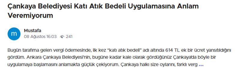 8 Ağustos tarihinde Mustafa adlı bir vatandaş, Çankaya Belediyesinin katı atık bedeli uygulamasına tepki gösterdi. 614 TL'lik ek ücretin, birçok Çankaya sakini tarafından anlamakta zorlanıldığını belirten Mustafa, uygulamanın nedenini ve amacını sorguladı.