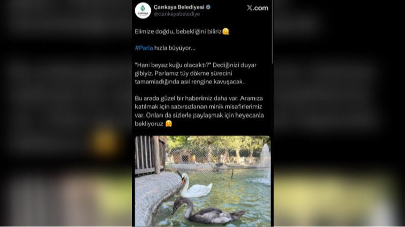 Tartışmanın merkezindeki paylaşımda, parkta doğan Parla isimli yavru kuğu hakkında da bilgi verildi. Belediyeden yapılan açıklamada, Parla’nın tüy dökme sürecinde olduğu ve tamamlandığında beyaz tüylerine kavuşacağı belirtildi.