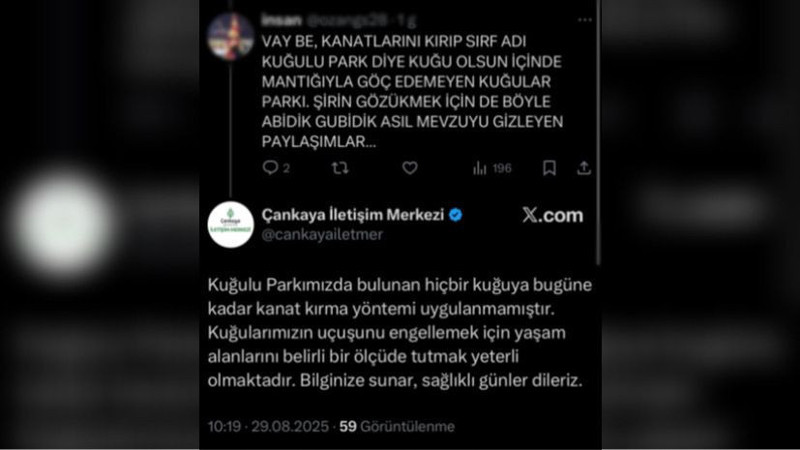Ankara’nın simgelerinden Kuğulu Park, sosyal medyadaki bir yorumla gündem oldu. “Kuğuların kanatları kırılıyor” iddiası kısa sürede çok sayıda kullanıcı tarafından görüntülendi. Çankaya Belediyesinden ise iddialara hızlı bir yanıt geldi.