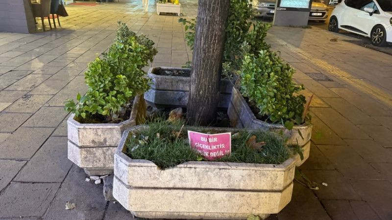 Cadde dizilen ağaçların altında tasarlanan çiçeklerin üstüne bırakılan notta caddeden geçenlere çöp uyarısı yapıldı. Vatandaşın notları farklı açılardan görmesinin de sağlanması için aynı not çiçeğin birkaç tarafına bırakıldı.