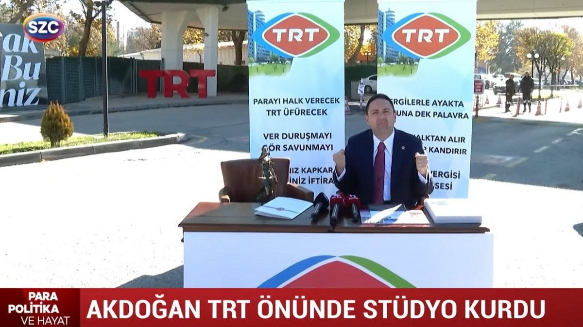 CHP Ankara Milletvekili Umut Akdoğan, Sözcü TV'de Damla Doğan Tuncel ile Para Politika’nın konuğuydu. Akdoğan, bu yayında gündemi değerlendirirken, kamu yayıncılığı yapmadığı gerekçesiyle eleştirdiği Türkiye Radyo ve Televizyon Kurumunun (TRT) Ankara'daki binası önünde gerçekleştirdiği dikkat çekici eylemin detaylarını ve perde arkasını anlattı. TRT'ye davet edilmemesi üzerine, kurumun önüne masasını, sandalyesini ve arka fonunu kurarak adeta bir "korsan stüdyo" oluşturan Akdoğan, programına konuk olarak Adalet Tanrıçası Temis heykelini almıştı.