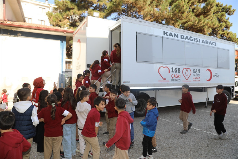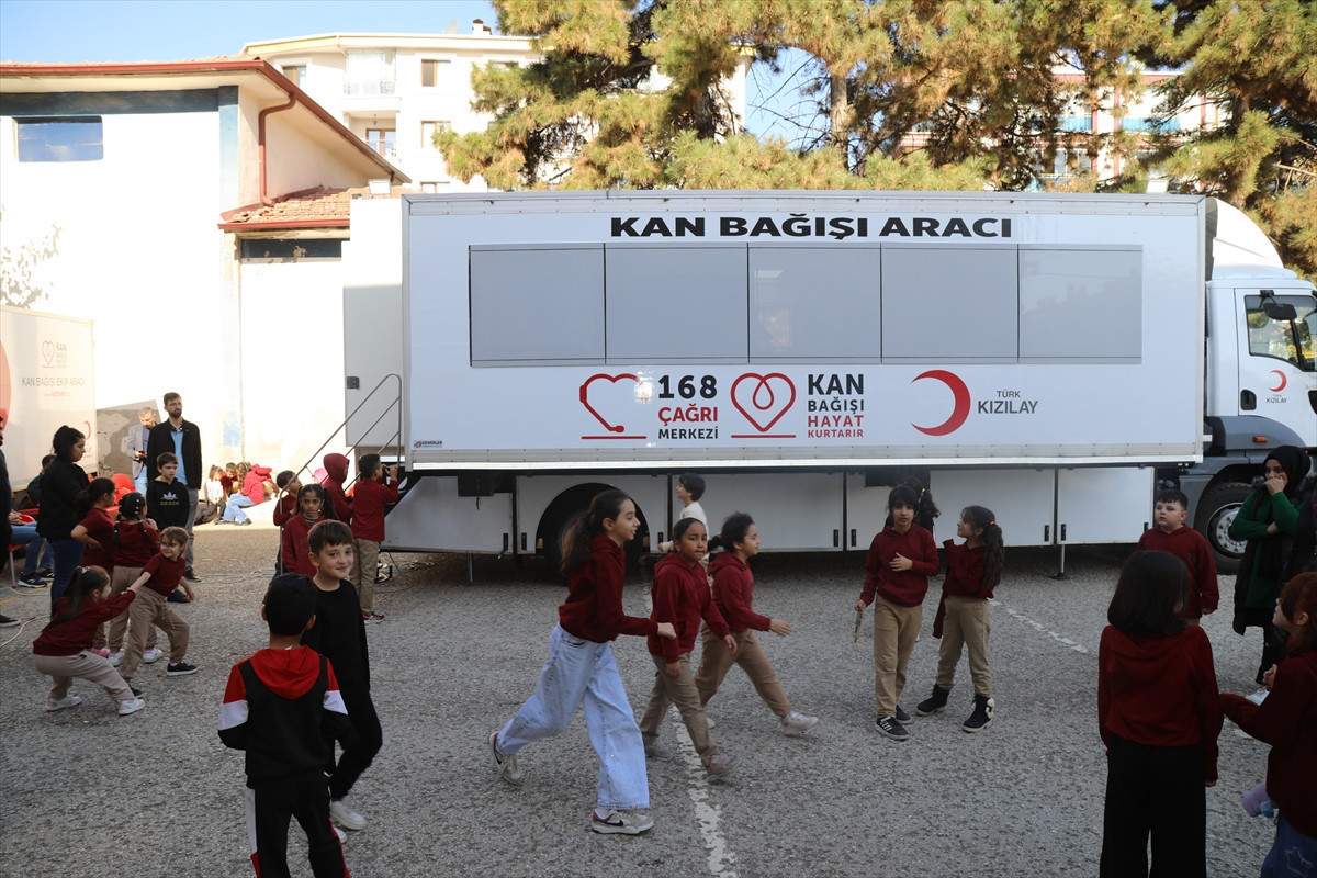 Türk Kızılay’a ait gezici kan alma aracı okul bahçesinde konuşlandırılırken, öğrenciler de velilerini kan bağışına teşvik etti.