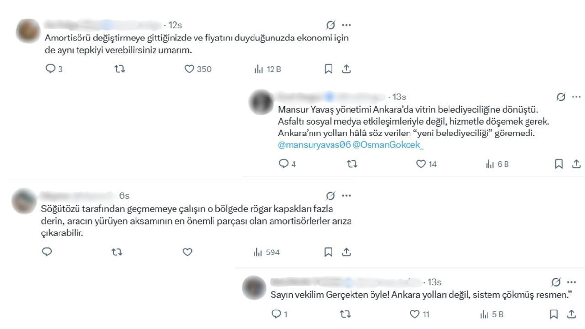 Bir diğer kullanıcı, “Sayın vekilim, gerçekten öyle! Ankara yolları değil, sistem çökmüş resmen.” derken, bir başka kullanıcı da sürücülere uyarıda bulunarak, “Söğütözü tarafından geçmemeye çalışın. O bölgede rögar kapakları fazla derin, aracın yürüyen aksamının en önemli parçası olan amortisörler arıza çıkarabilir.” yorumunu yaptı.