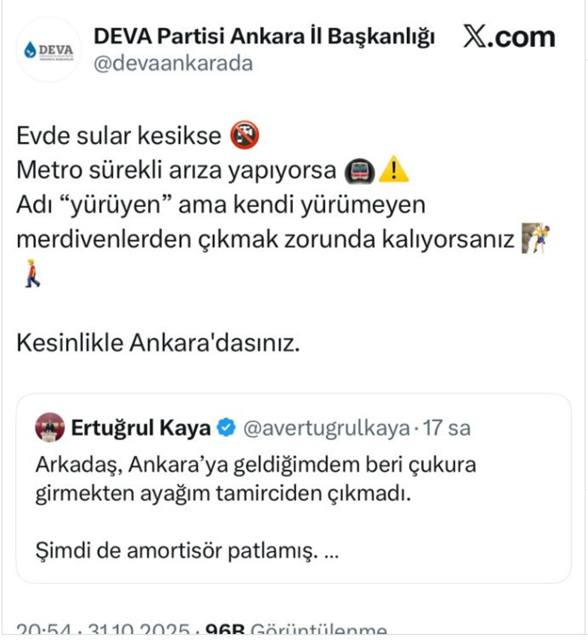 31 Ekim tarihinde Ertuğrul Kaya'nın X hesabından paylaştığı, "Arkadaş, Ankara’ya geldiğimden beri çukura girmekten ayağım tamirciden çıkmadı. Şimdi de amortisör patlamış.." sözlerini DEVA Partisi Ankara İl Başkanlığı resmi X hesabından alıntılayarak, Ankara'nın sorunlarını dile getirmişti. Daha sonra DEVA Partisi Ankara İl Başkanlığı, söz konusunu paylaşımı silmişti. Bu konuya ilişkin açıklamalarda bulunan Gülören, "Biz masum bir şekilde Ankara'nın sorunlarını dile getirmiştik. Daha öncede böyle paylaşımlarımız olmuştu. Kurumsal hesabımızdan bu tarz paylaşımlar yapmama kararı aldık" dedi.