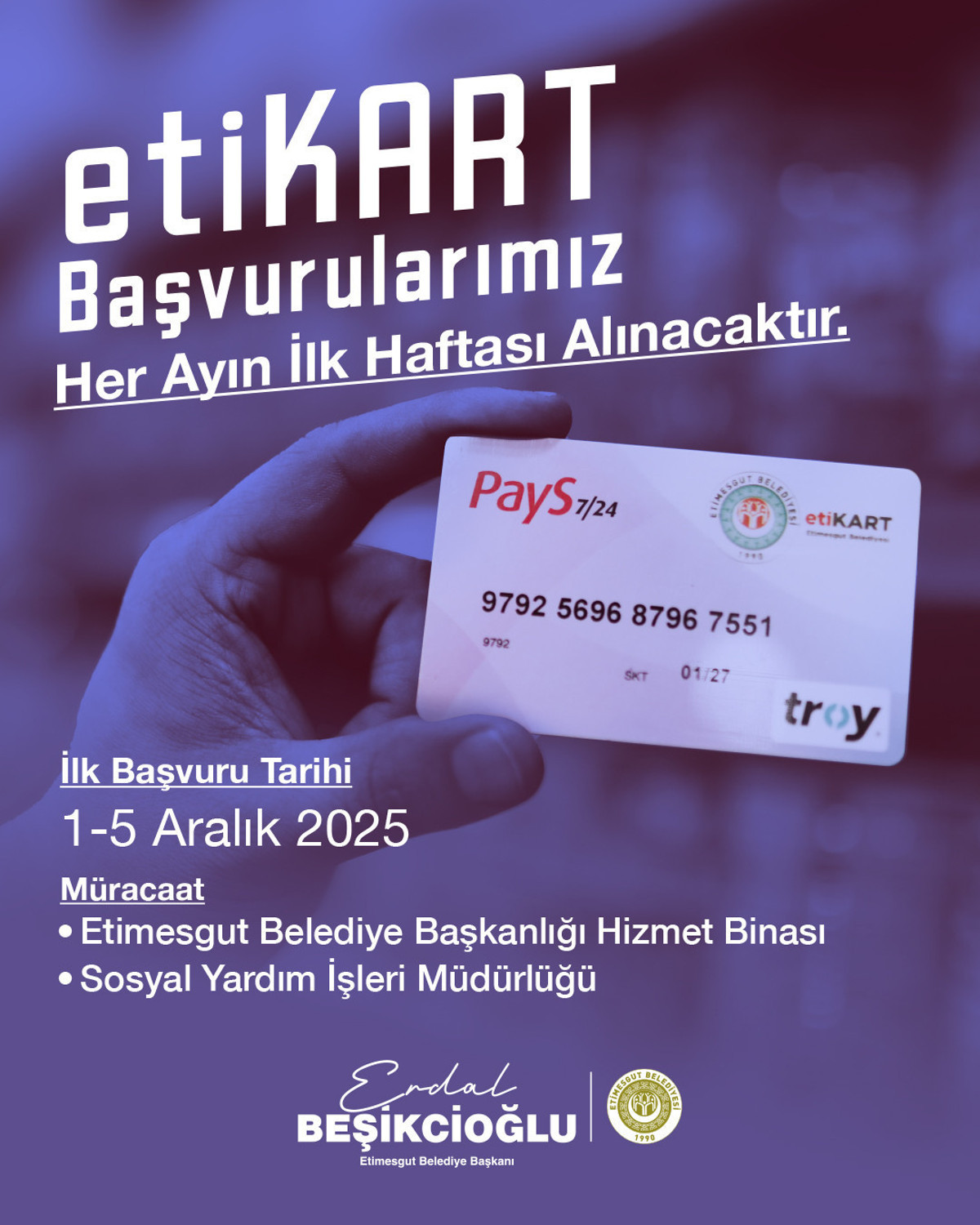 Etimesgut Belediyesi, ihtiyaç sahibi ailelerin temel ihtiyaçlarını karşılayabilmeleri amacıyla hayata geçirdiği etiKART uygulaması için başvuruların 1–5 Aralık 2025 tarihleri arasında alınacağını duyurdu.